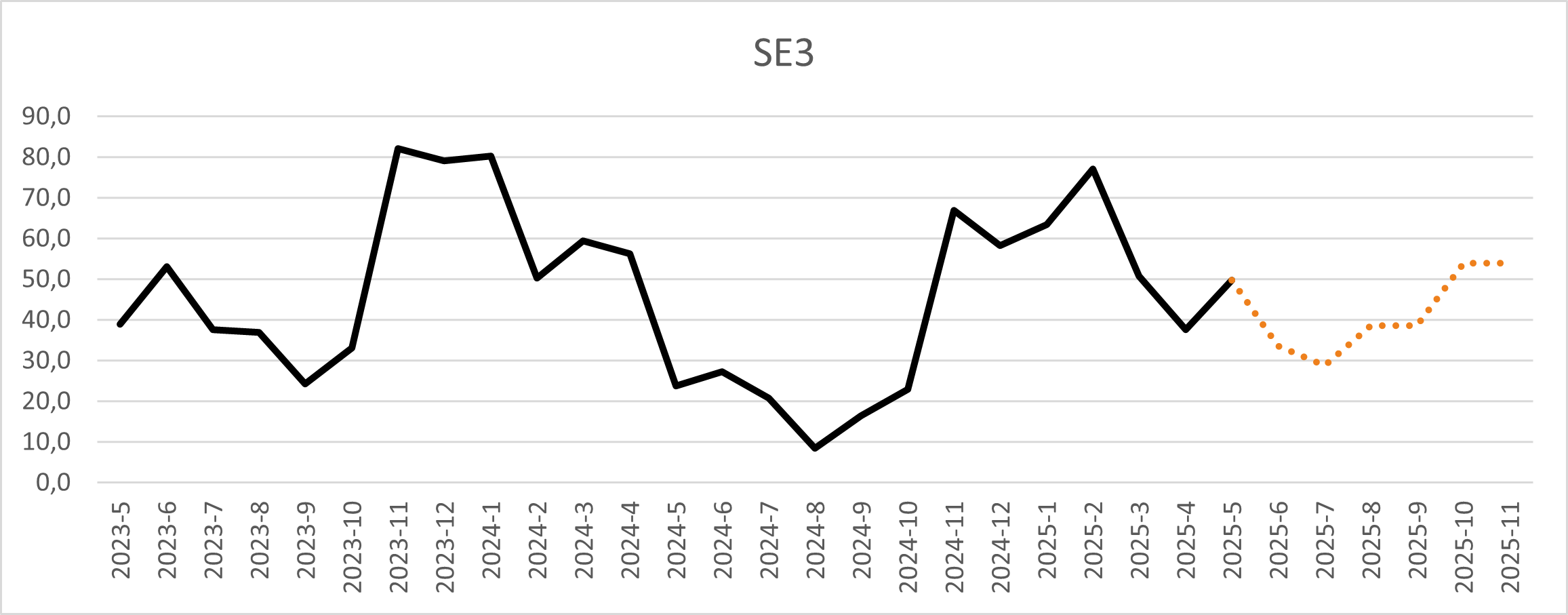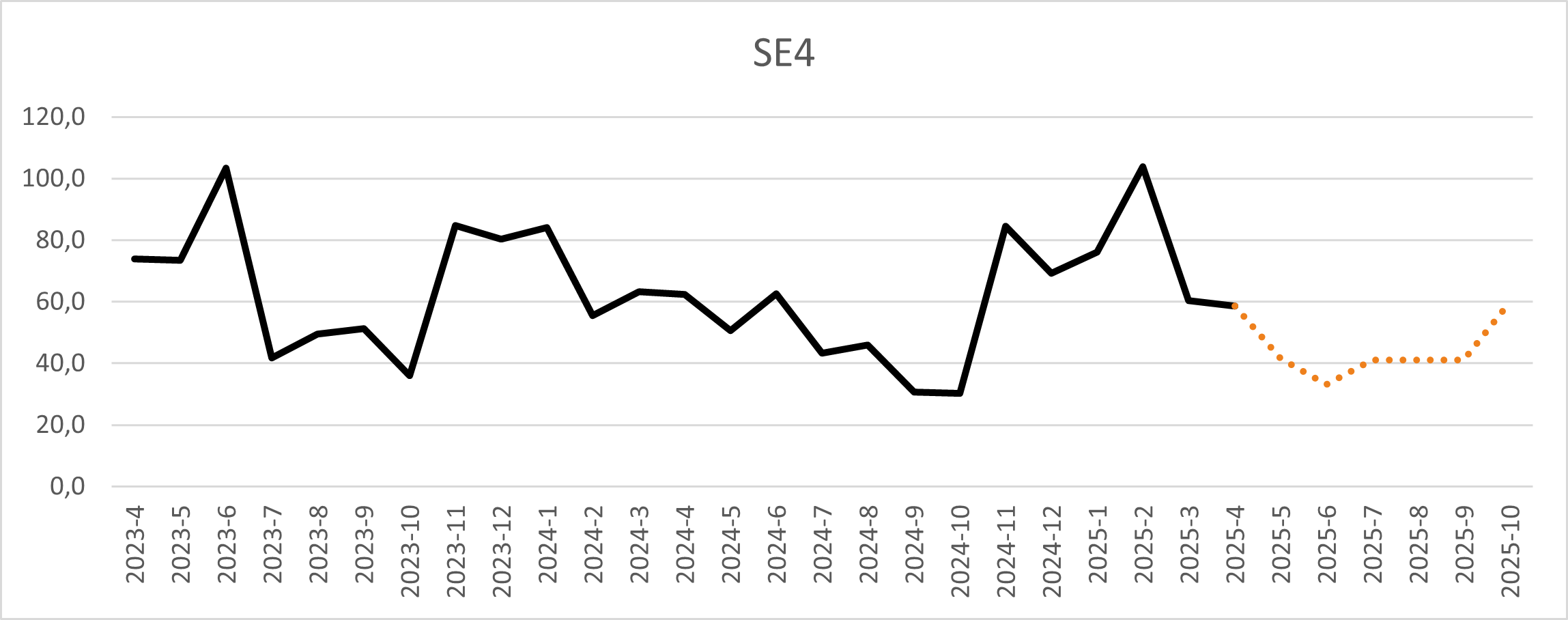 Prognosen avser spotpriset i våra fyra elområden för kommande sex månader. Spotpris är det dagliga priset som sätts på el baserat på tillgång och efterfrågan på den nordiska elbörsen.
